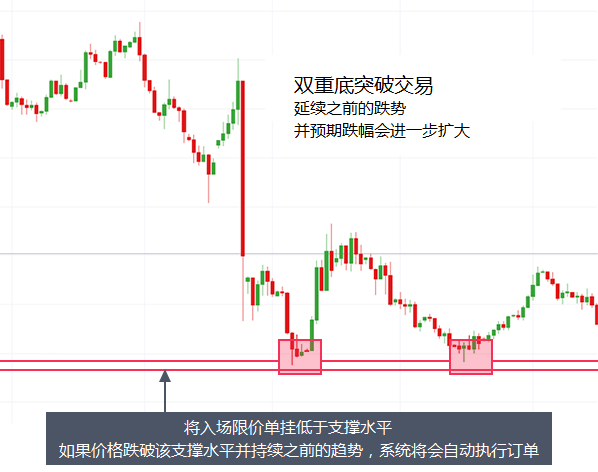 如其他突破类交易策略相似,交易双重顶或双重底突破就是期待价格动向会延续之前的趋势,并等待之前的支撑或阻力水平在第三次尝试时被打破,然后再进入市场。以下图为例:
