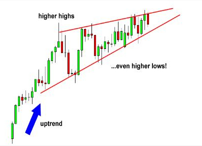 在这里,支撑线的倾斜程度要甚于阻力线的倾斜程度。这意味着不断抬高的低点形成速度要快于不断抬高的高点。