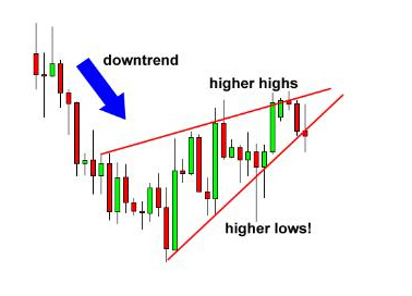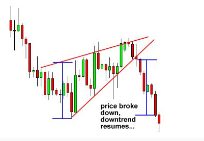 当作为持续信号出现时,它形成于上升趋势进行中,意味着价格将重启上升趋势。和上升楔形不同,下降楔形是一个看涨形态。
