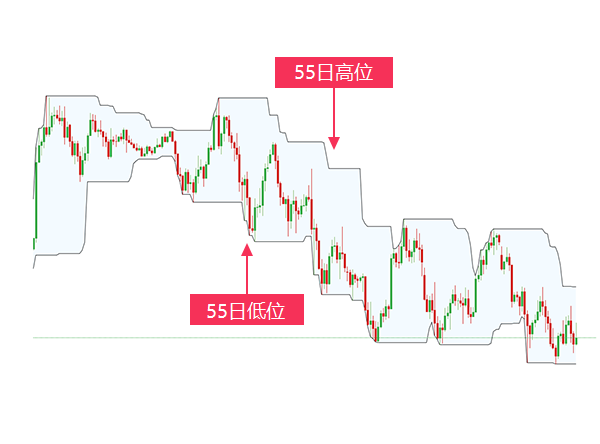 唐奇安通道显示的是某一时间段内的最高位以及最低位,如果通道的参数设置为55,则代表着55天里的最高位和最低位。对于希望将止损点设置的距离较当前价格远一些的交易者来说,将唐奇安通道的时间参数设置高一些会是不错的选择;而对于希望将止损点设置的距离较当前价格近一些的交易者来说,将唐奇安通道的时间参数设置低一些会更好。