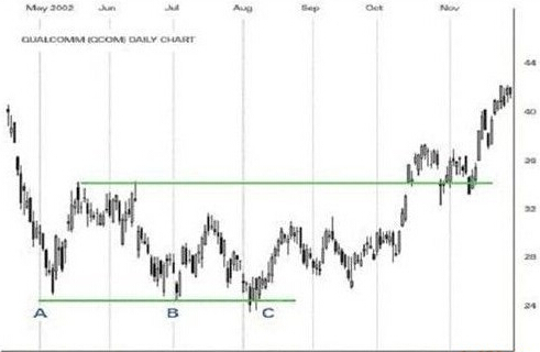 上述例子显示,当价位下降至A点,交易随即徘徊在这区域约四个月,但未能穿破B点和C点的支持位。因供过于求,价格开始上升至前市的某些高位。三重底的阻力位(即上图的高线),以及再升破阻力位。三重底形态因而确认。随后又再次回调到一个新的支持位(即前市的阻力位),但未能转为牛市,这更能增强三重底图形的力量。